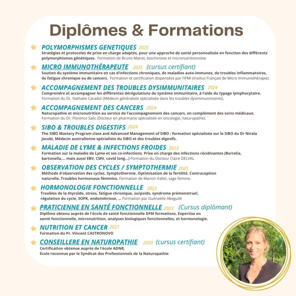 Passionnée par la santé naturelle depuis plus de 20 ans, j’ai passé ma certification de naturopathe auprès de l’école ADNR, reconnue par le Syndicat des Professionnels de la Naturopathie (SPN). J’ai ensuite été diplômée en tant que Praticienne en santé fonctionnelle (DFM Formations), et en tant que micro-immunothérapeute (IFMI). J’ai par ailleurs suivi plusieurs autres formations, afin de me spécialiser dans différents domaines.